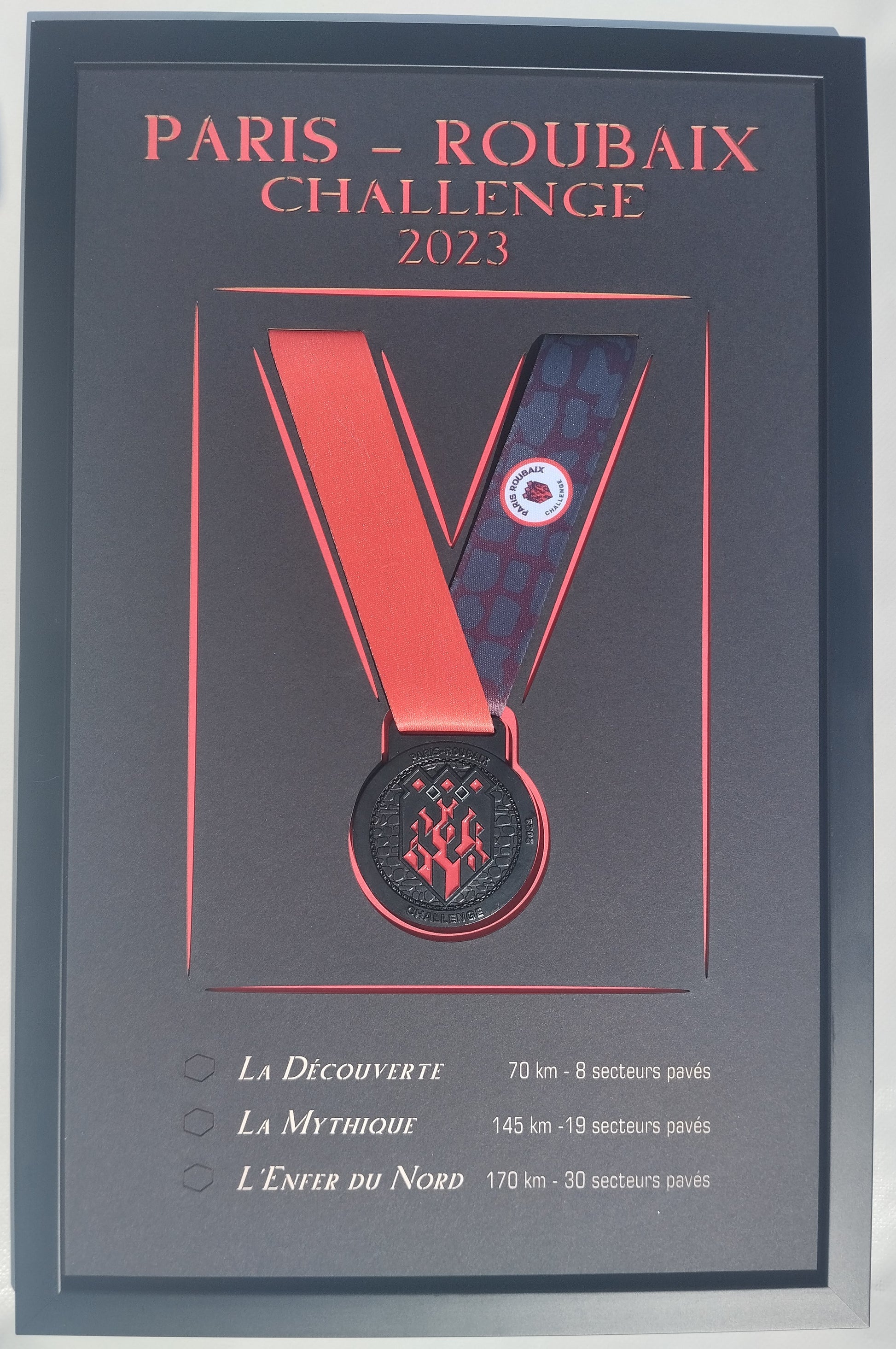 Fans de cyclisme nous avons imaginé pour vous ce cadre afin de mettre en valeur votre médaille de Finisher ddu Paris Roubaix Challenge 2023.